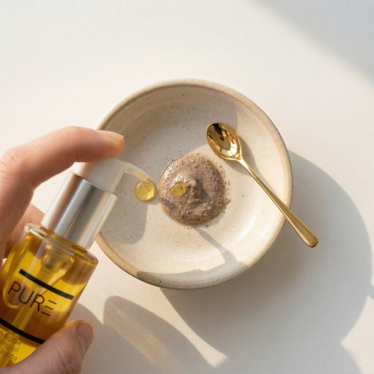 - Step 2: Add 2 pumps of PURE Clean & Glow cleansing oil and a few drops of water.
